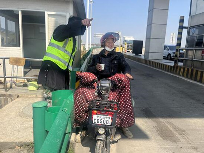 3月2日14時,徐家堡站入口13號車道內(nèi),收費員華蕾發(fā)現(xiàn)在排隊車流中有一位老人騎行著小電動車緩緩而來,當老人行駛到收費窗口時,收費員立即伸手攔截,并大聲呼叫停車,但老人并未理會直徑?jīng)_上高速,收費員立即上報監(jiān)控員及現(xiàn)場班長電動車沖崗上站。