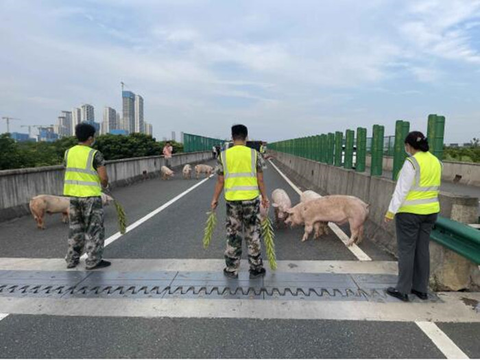 6月9日下午17:50左右,龔家鋪站出口閘道處,一輛滿載生豬的貨車發(fā)生側(cè)翻,車上大半生豬瞬間沖出鐵籠,一瞬間,高速公路亂成一片,豬豬們哼哼著四處亂竄。