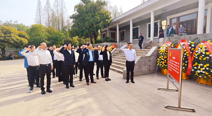 三家單位的40余名黨員代表齊聚李先念故居紀念園。進入紀念園,莊重的敬獻花籃儀式拉開帷幕,黨員代表們邁著整齊且緩慢的步伐,手捧花籃,緩緩行至李先念同志雕像前,輕輕放下花籃,承載著全體黨員對革命先輩的無盡追思與崇高敬意。現場,全體黨員神情肅穆,深深鞠躬,向李先念同志致以深切緬懷。