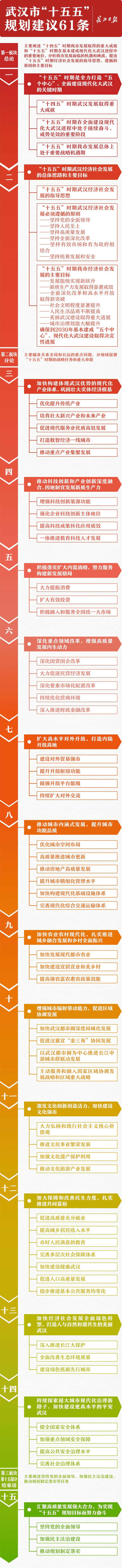 《中共武漢市委關于制定全市國民經濟和社會發展第十五個五年規劃的建議》共有15個部分、61條,分為三大板塊。