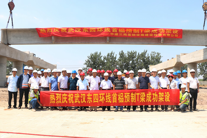 2018年7月16日上午11時,隨著起重指揮員一聲哨響,武漢東四環線跨八吉府路分離立交橋左幅11-3#預制T梁準確完成落位,標志著武漢東四環線首榀預制T梁成功架設,由此拉開了武漢東四環線橋梁上部結構施工的序幕,東四環公司和各參建單位共同見證了這一重要時刻。