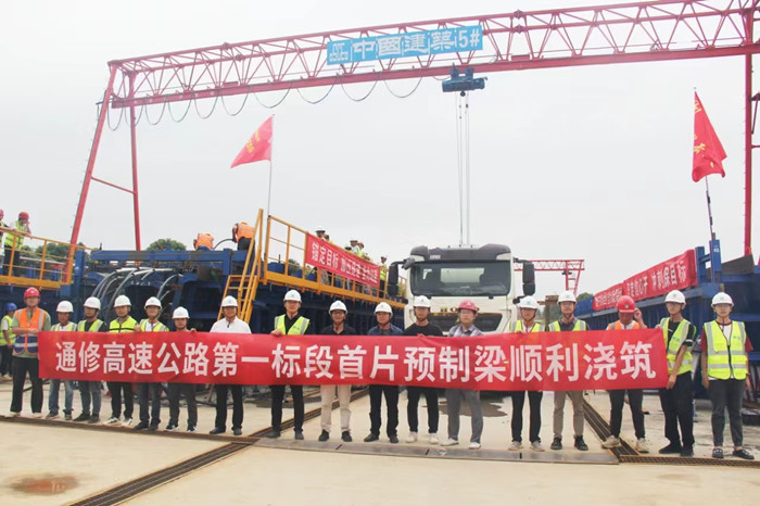 9月13目上午10點(diǎn)18時(shí),通修高速公路首片預(yù)制箱梁在通修高速公路第一標(biāo)段項(xiàng)目部梁場順利澆筑。