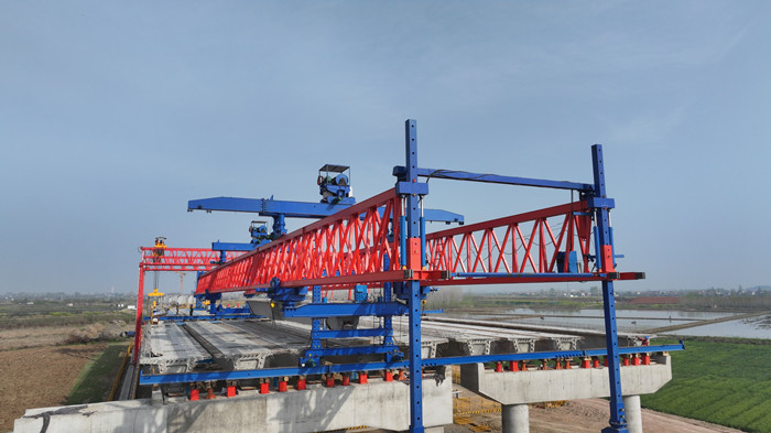 項(xiàng)目沿線處于長江沖洪積平原地區(qū),地下水豐富、沿線魚塘密布,周邊建筑材料資源匱乏。為此,項(xiàng)目團(tuán)隊(duì)通過采用膜袋吹砂快速成型工藝進(jìn)行水網(wǎng)密布區(qū)域便道修筑、設(shè)置鉆渣改良基地等方式確保了施工進(jìn)度。本次鋼混梁的成功吊裝,先后攻克“大構(gòu)件、高精度、強(qiáng)協(xié)同”三大難關(guān),為后續(xù)橋面鋪裝、附屬設(shè)施安裝奠定堅(jiān)實(shí)基礎(chǔ)。