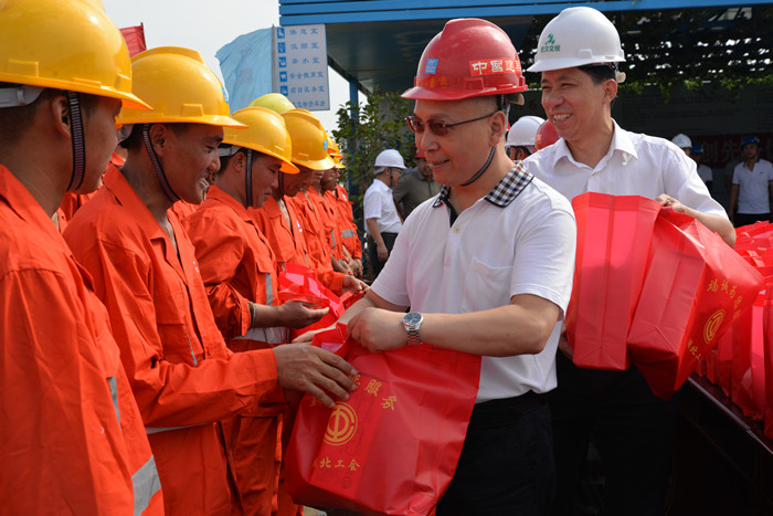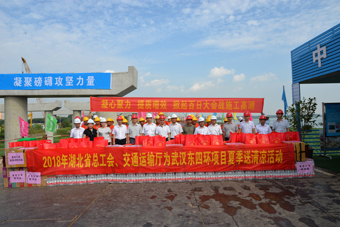 驕陽似火,熱浪襲人。7月26日,湖北省總工會黨組成員、副主席李春舫在省交通運輸廳工會副主任江飛、省交通運輸廳重點建設辦副主任徐建明一行的陪同下,來到武漢交投集團東四環線項目建設工地,看望慰問高溫下堅守在重點工程建設一線的產業工人,向他們送去夏日里的一片“清涼”。武漢交投集團黨委副書記、總經理陳順平,黨委副書記、紀委書記楊凡,集團總經理助理、東四環公司總經理王先強參加了慰問活動。