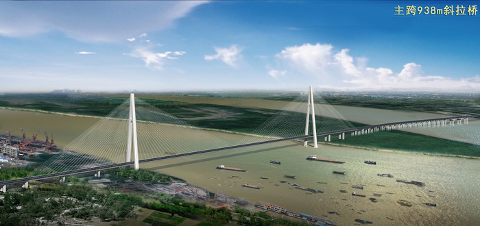 武漢青山長江大橋是武漢市第十一座長江大橋,是武漢四環線東段跨越長江的控制性工程。路線起點接四環線東段,在武鋼外貿碼頭下游的大眾碼頭處跨越長江,終止于黃陂區花樓街,接四環線北段,全線均為橋梁。路線全長為7.548km,其中長江大橋4.374km,接線引橋3.174km,主航道橋采用主跨938m雙塔鋼箱及鋼箱結合梁斜拉橋方案。項目全線采用雙向八車道高速公路標準建設,設計速度為100 km /h。全線設置大橋監控管理分中心1處(含養護工區)。項目批復概算56.03億元,工期4年,于2015年10月開工,計劃于2019年10月完工。