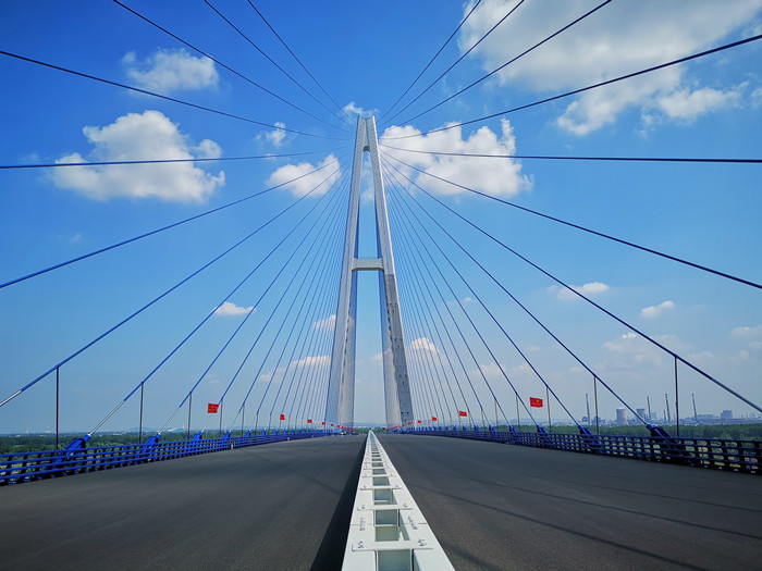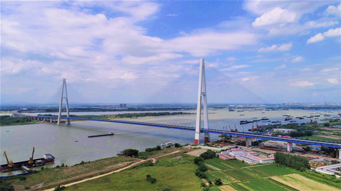 看青山橋,須晴日,當遠觀。兩座云白色的橋塔直沖云霄,與朵朵白云相映襯,撐起南北兩岸巨傘般的252根天藍色斜拉索,與上下游的青山綠水交相輝映,構成長江主軸上一幅水天一色的美景。