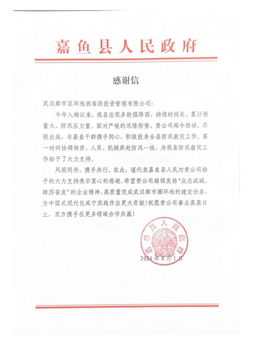 這封感謝信是對漢南長江大橋項目公司在防汛救災關鍵時刻挺身而出的充分肯定,漢南長江大橋項目公司將在集團黨委堅強領導下,繼續履行國企社會責任,以高度的責任感和使命感扎實推進武漢都市圈環線高速公路漢南長江大橋及接線工程建設工作,為充分發揮大武漢都市圈同城化輻射作用提供強力交通支撐。
