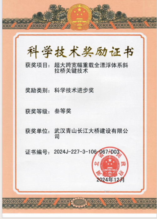 2025年1月6日,湖北省科技創(chuàng)新大會(huì)在武漢舉行。交投集團(tuán)所屬青山長(zhǎng)江大橋公司“超大跨寬幅重載全漂浮體系斜拉橋關(guān)鍵技術(shù)”獲得湖北省科學(xué)技術(shù)進(jìn)步獎(jiǎng)三等獎(jiǎng)。