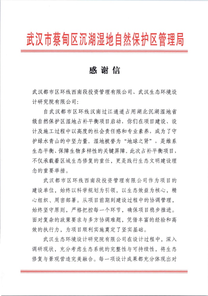 初夏六月,荷尖初露,武漢都市圈環(huán)線高速公路漢南長(zhǎng)江大橋及接線工程沉湖濕地保護(hù)區(qū)內(nèi)蛙鳴漸起、蒲草搖曳,處處涌動(dòng)著蓬勃生長(zhǎng)的活力。在這萬(wàn)物競(jìng)發(fā)的美好時(shí)節(jié),項(xiàng)目團(tuán)隊(duì)收到了來(lái)自蔡甸區(qū)沉湖濕地自然保護(hù)區(qū)管理局的感謝信。信中特別指出,項(xiàng)目團(tuán)隊(duì)以科學(xué)的生態(tài)修復(fù)方案和高效的執(zhí)行能力,在重大交通基礎(chǔ)設(shè)施建設(shè)與濕地生態(tài)保護(hù)間找到了平衡點(diǎn),繪就了建設(shè)發(fā)展與生態(tài)保護(hù)同頻共振的和諧圖景,為同類項(xiàng)目樹(shù)立了標(biāo)桿。這也標(biāo)志著該項(xiàng)目濕地“占補(bǔ)平衡”工作圓滿收官,在兼顧生態(tài)效益與工程可行性具體實(shí)踐路徑上又探索出了新路徑。