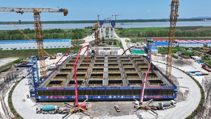作為大橋的“定海神針”,錨碇承擔著拉住主纜的關鍵作用。漢南長江大橋的錨碇沉井規(guī)模巨大,其基礎平面尺寸達76.4米×76.4米,面積約5837平方米,相當于14個標準籃球場大小,被譽為公路工程世界第一大沉井。沉井總高43米,將分8節(jié)澆筑成型。此次南岸沉井完成了第五節(jié)(高度4.5米)的混凝土澆筑,澆筑量約7650立方米。