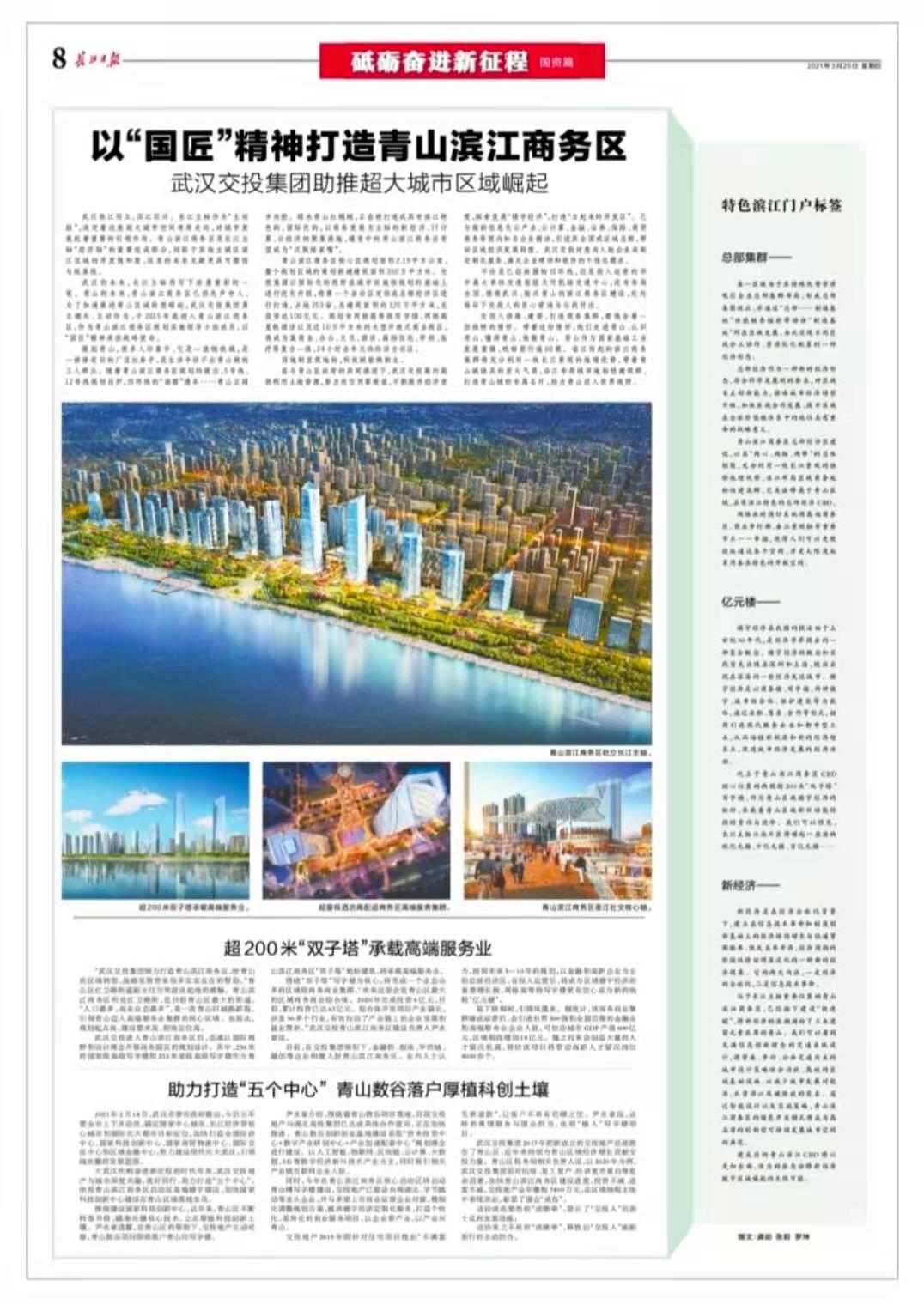 武漢的未來(lái),長(zhǎng)江主軸將寫(xiě)下濃墨重彩的一筆。青山的未來(lái),青山濱江商務(wù)區(qū)已然先聲奪人。為了加速推進(jìn)青山區(qū)域轉(zhuǎn)型崛起,武漢交投集團(tuán)勇立潮頭、主動(dòng)作為,于2015年底進(jìn)入青山濱江商務(wù)區(qū),作為青山濱江商務(wù)區(qū)規(guī)劃實(shí)施領(lǐng)導(dǎo)小組成員,以“國(guó)匠”精神承擔(dān)戰(zhàn)略使命。